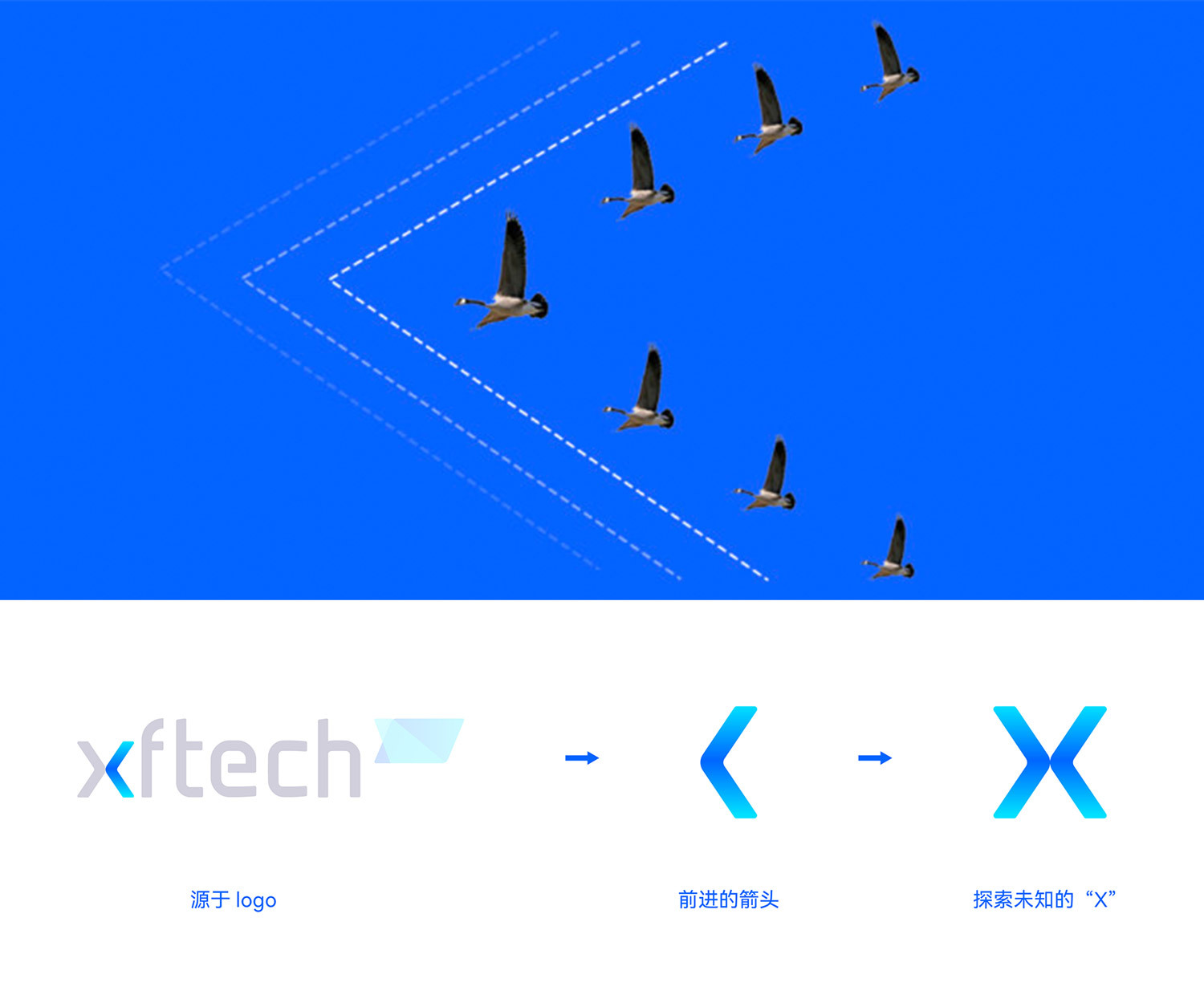 信飛原來的LOGO由圖標和中英文字標兩部分構成,圖形上一眼辨別出「信飛」這個品牌想傳達的信息,且原藍色較為傳統(tǒng)。全新設計的LOGO由四部分組成,其中包括英文字標「xftech」、中文字標「信飛」、一個藍色漸變的圖標和「X」符號。