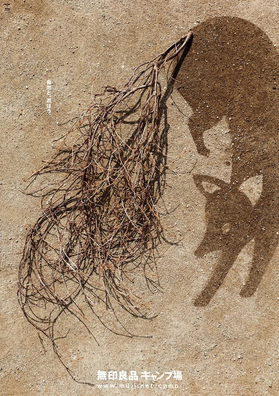 2022年無(wú)印良品露營(yíng)場(chǎng)最新主題海報(bào),以“自然と、遊ほう。”(與自然游玩)為主題。透過(guò)用水在地上噴出的陰影與樹(shù)枝,巧妙地勾勒出了鹿、狐貍和鹿角蟲(chóng)等質(zhì)樸又帶有童趣的形象。