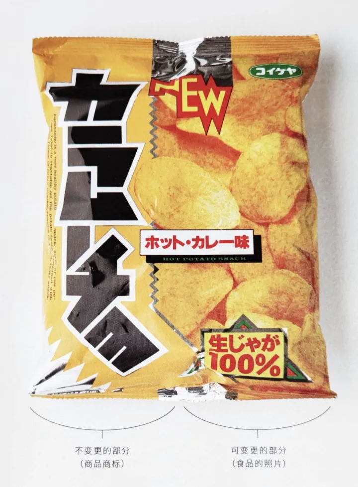 于是,佐藤卓的提案設(shè)計(jì)中,包裝袋的左邊是咔辣姆久的商標(biāo),右半部分是袋內(nèi)食品的照片。他的方案就是考慮到,將來即使被迫更新設(shè)計(jì),包裝袋仍能保持原有的形式。這是以預(yù)測(cè)將來會(huì)更新設(shè)計(jì)為前提,有保存了固定結(jié)構(gòu)的設(shè)計(jì)方案。