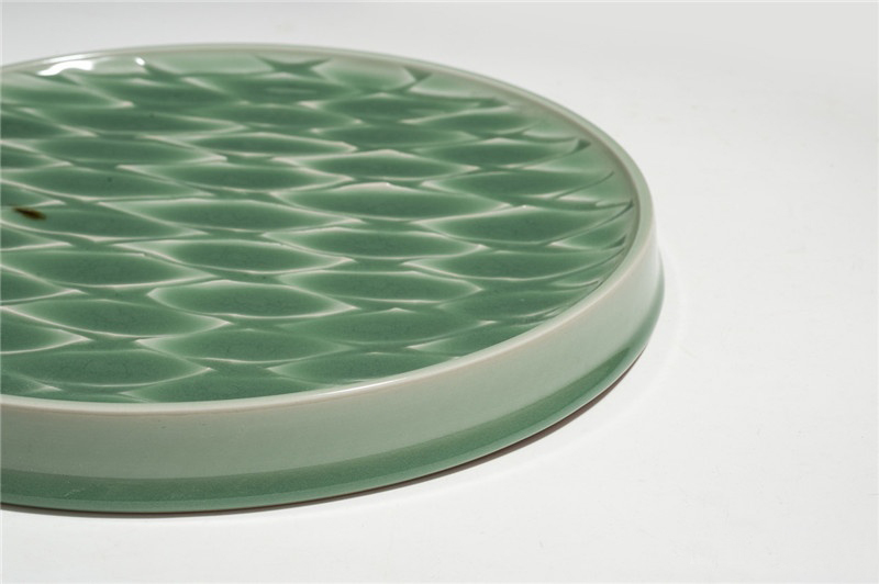 ▲ “格子”青瓷盤,運(yùn)用陽(yáng)刻雕琢格子的紋路,通過(guò)有色的厚薄呈現(xiàn)深淺不一的色澤和質(zhì)感,仿佛是波光粼粼的水面反射著陽(yáng)光。