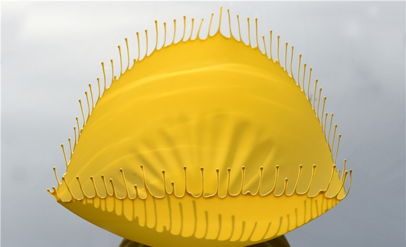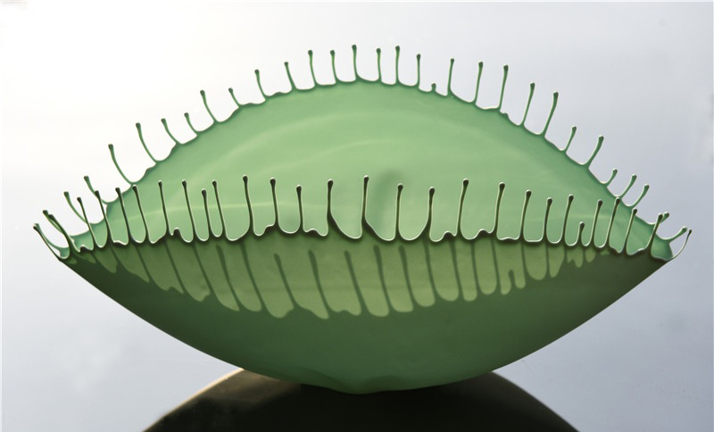 玻璃,是對(duì)于東方視覺(jué)世界的象征,即,它不是一種固體,而是一種高度黏稠的液體,即使它看起來(lái)具有形體,實(shí)際上是欠缺和難以捉摸的,甚至光的加入也不能發(fā)揮它的作用。卞曉東的瓷器,以薄如蟬翼的薄胎瓷表現(xiàn)了一個(gè)破繭成碟后的蠶繭,胎體上的褶皺與濺出的須柱是模擬小小個(gè)體在蛻變前迸發(fā)的強(qiáng)大力量,代表蛹從繭中出現(xiàn)的瞬間,一種變化的形態(tài),不是雕刻石頭,而是水的跳躍。