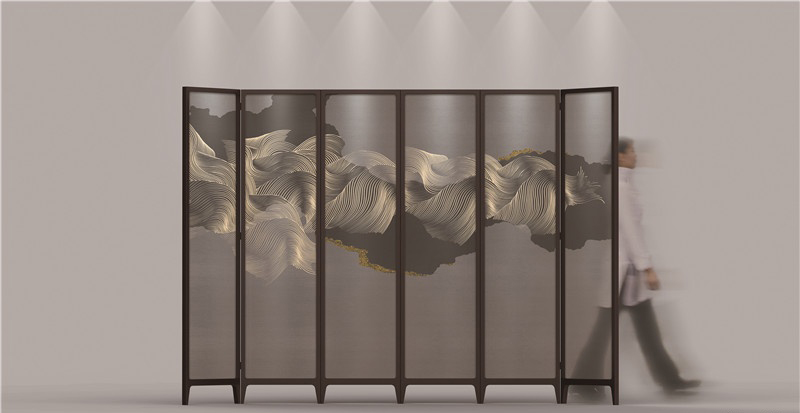 ▲ 水韻系列雙面繡落地屏風(fēng),由馬聰創(chuàng)作,以抽象簡約的云水紋樣,結(jié)合中國非物質(zhì)文化遺產(chǎn)——雙面繡手工藝,或?yàn)椴ɡ藸?,似水流?dòng),或?yàn)樵茍F(tuán)狀,似隱似現(xiàn),以其飄逸靈動(dòng)、回轉(zhuǎn)交錯(cuò)的結(jié)構(gòu)表達(dá)了東方美學(xué)“疏密有致”的意境美感和“虛實(shí)有度”的審美張力。